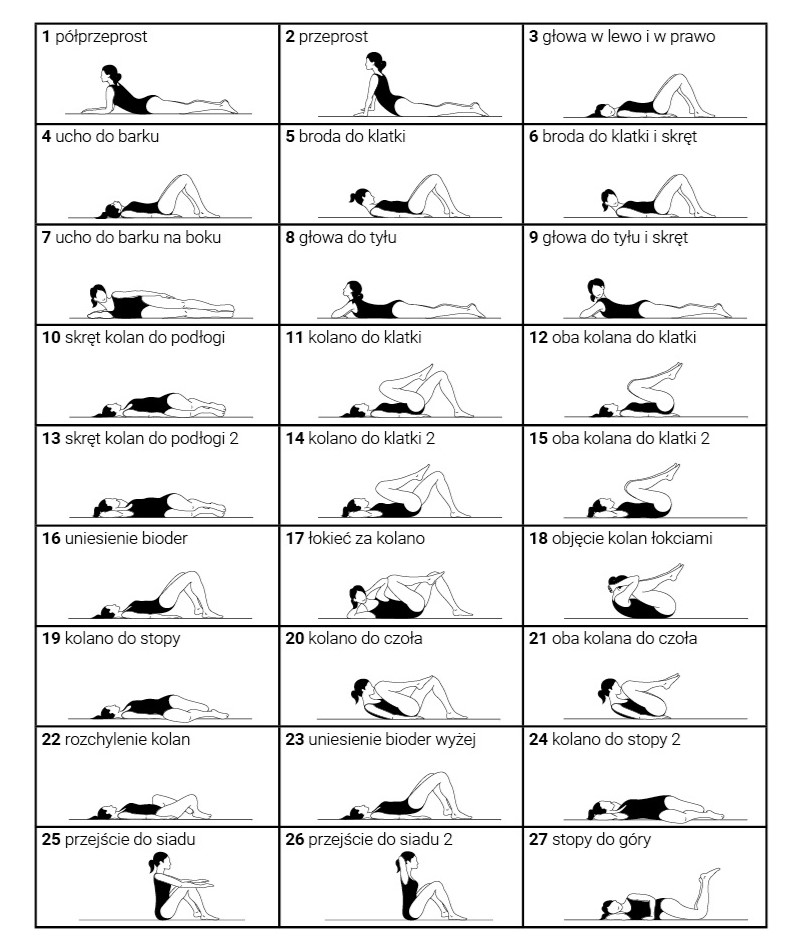 Zestaw obejmuje 27 prostych pozycji i ruchów, które mają na celu odciążenie kręgosłupa, poprawę jego ruchomości oraz zmniejszenie dolegliwości bólowych w odcinku lędźwiowym.