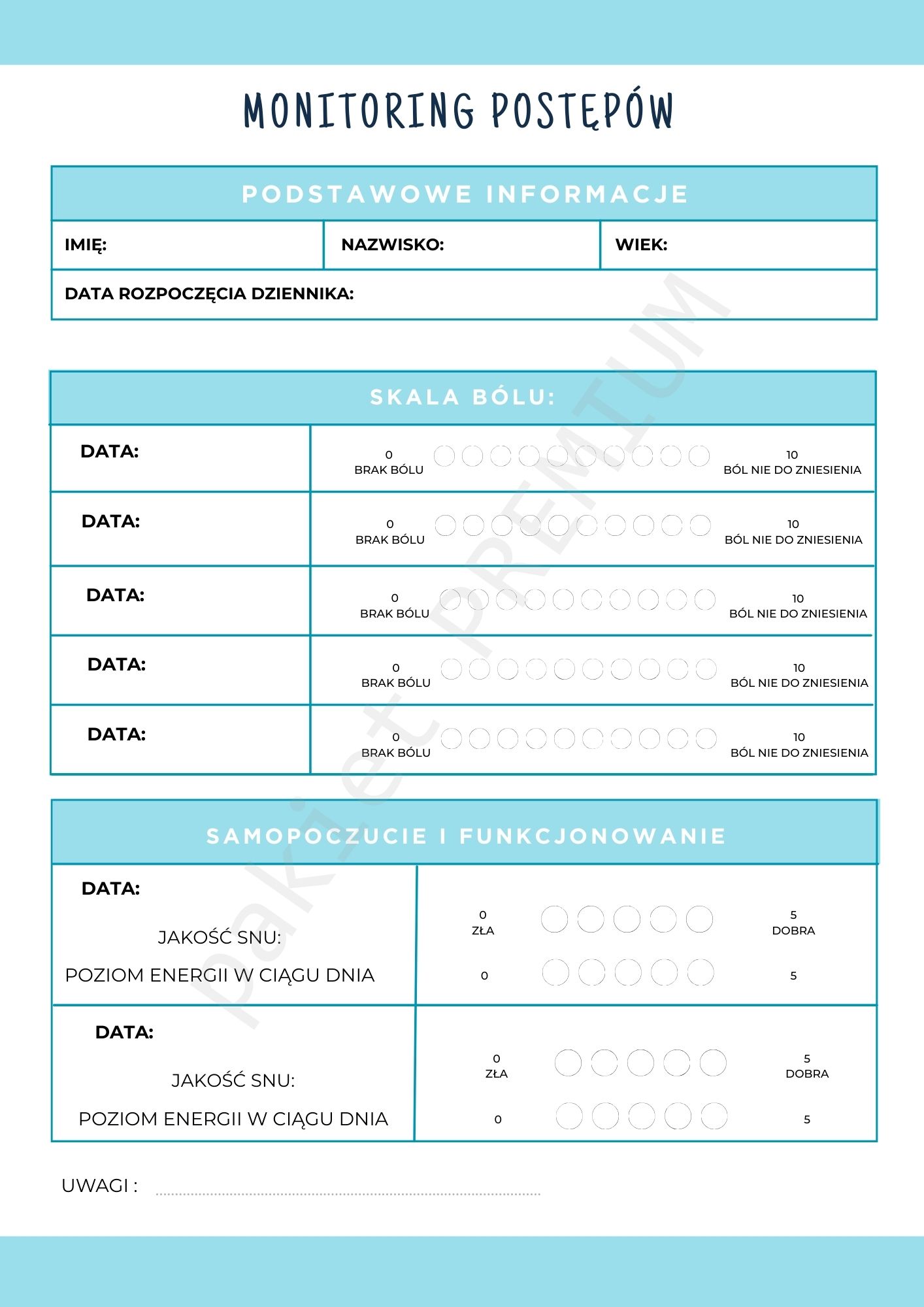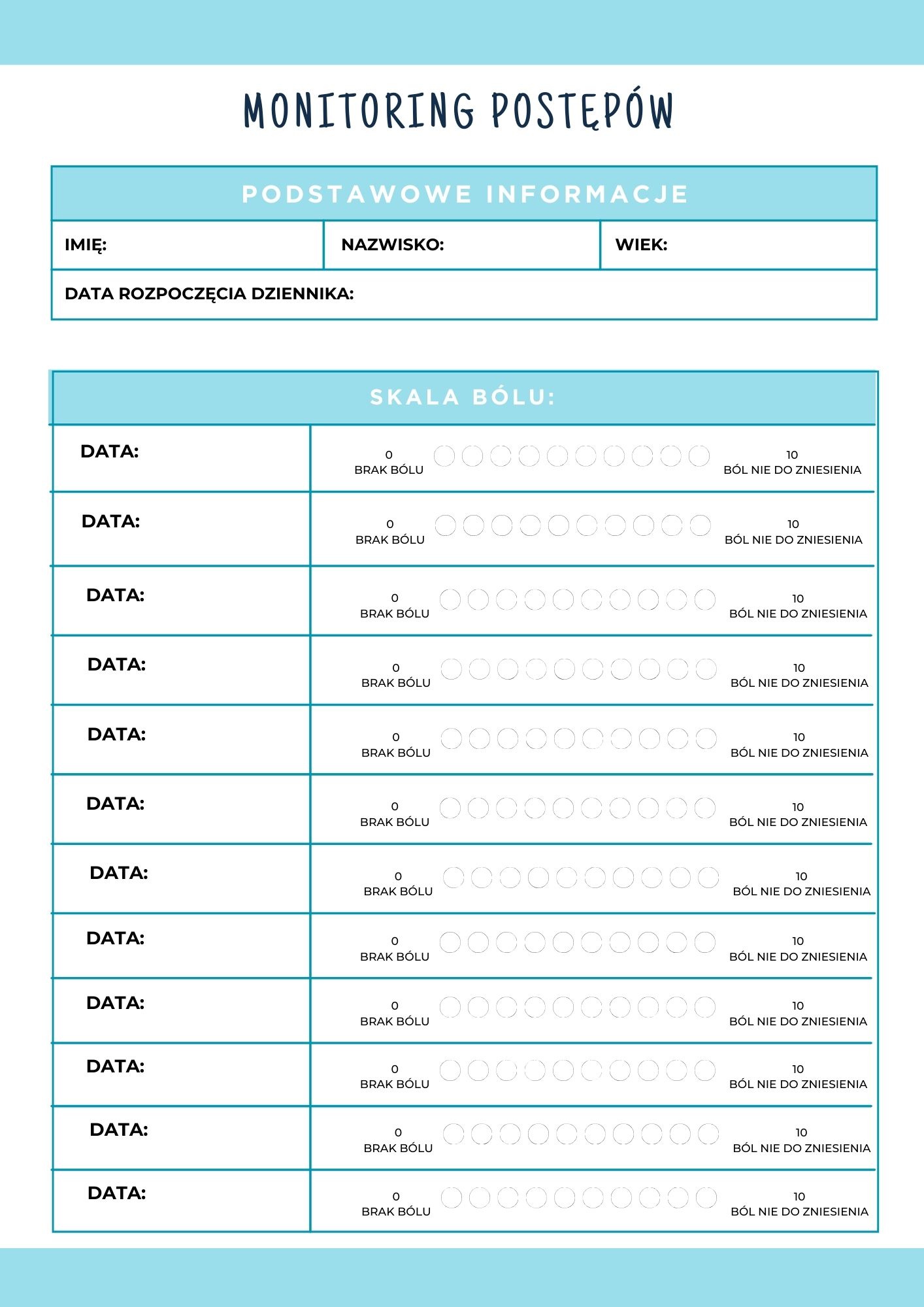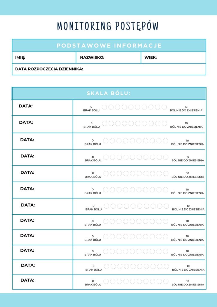 Darmowy pakiet stworzony z myślą o osobach, które chcą rozpocząć swoją przygodę z monitorowaniem zdrowia kręgosłupa. Umożliwia pobranie formularza PDF do samodzielnego wypełnienia i systematycznego notowania poziomu bólu oraz wykonywanych ćwiczeń. To prosty, ale skuteczny sposób, by zrobić pierwszy krok w stronę świadomej profilaktyki i lepszej kontroli nad własnym zdrowiem.