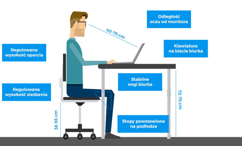 Osoby pracujące w biurze często skarżą się na bóle kręgosłupa, bóle głowy, oczu czy drętwienie rąk. Przyczyną tych dolegliwości bardzo często jest brak odpowiednio dostosowanego stanowiska pracy, co może prowadzić do licznych konsekwencji zdrowotnych. Zastosowanie zasad ergonomii pozwala jednak znacząco zmniejszyć ryzyko ich wystąpienia oraz poprawić komfort codziennej pracy.Niewłaściwe ustawienie krzesła, biurka i monitora sprzyja przeciążeniom kręgosłupa, co w dłuższej perspektywie może powodować uporczywe bóle pleców i szyi.