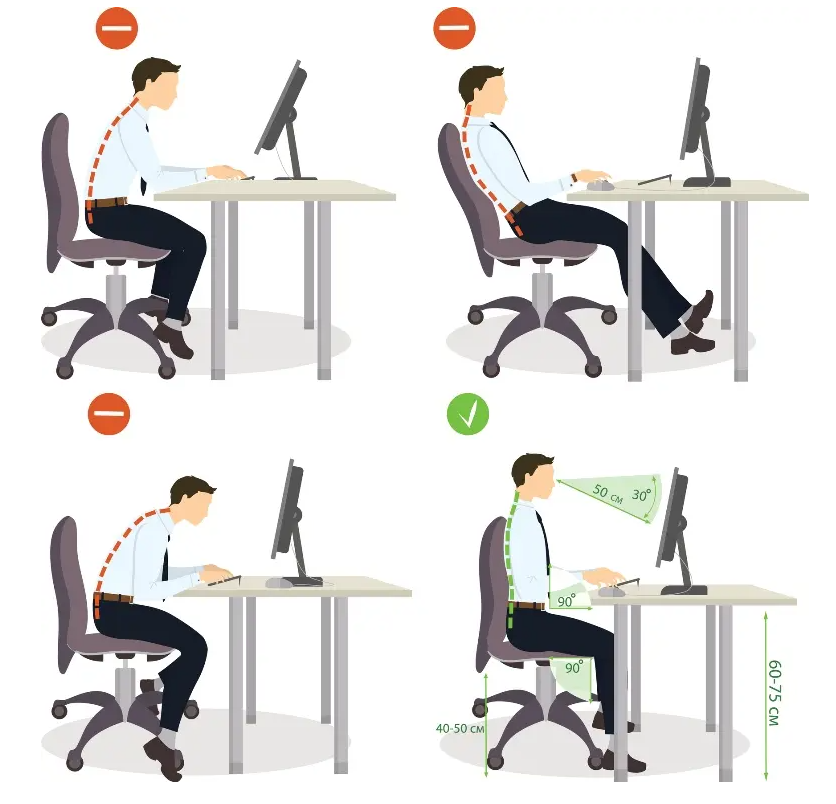Odpowiednie ustawienie krzesła, biurka i monitora wspiera zdrową sylwetkę.